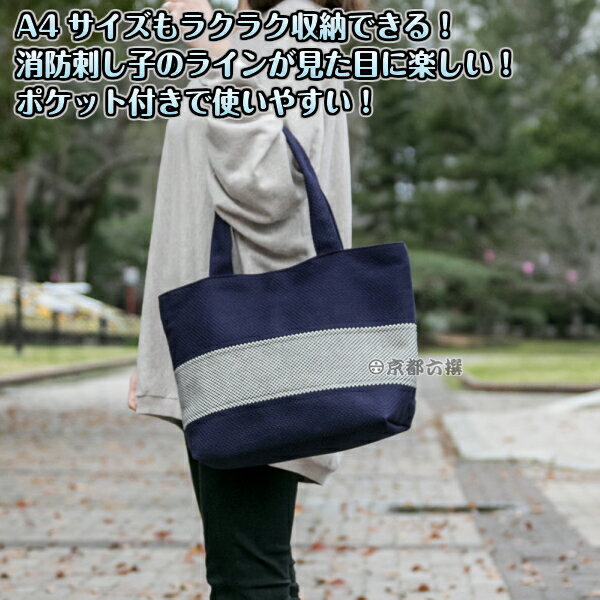 ■ 商品説明 ■ 丈夫な刺子生地を使用した日本製トートバッグです! バッグ中央に入った消防刺子柄の太いラインが見た目にも楽しく、A4サイズの書類もラクラク入る収納力があって見た目と使いやすさを両立しています! シンプルなデザインなので刺子生地の凸凹がよく映え、カラーのコントラストを楽しめます! 内側にはファスナー付きのポケットがあって小物の収納にも便利! 柔道着や火消し半纏などに使われる刺子生地を使用しており、軽くて丈夫! 柔道着や空手着を作っている老舗メーカーが製造しているので頑丈さにかけては折り紙つき! もちろん、すべての工程を国内で行っている安心の日本製なので品質もバッチリ! 柔道着の刺子生地は試合用のもので約200kg以上、学校の授業用のものでも5〜60kgぐらいの力の引っ張りには耐えると言われており、とにかく頑丈! シーンを問わず様々な用途に使える上品なデザインのオシャレで便利なバッグです♪