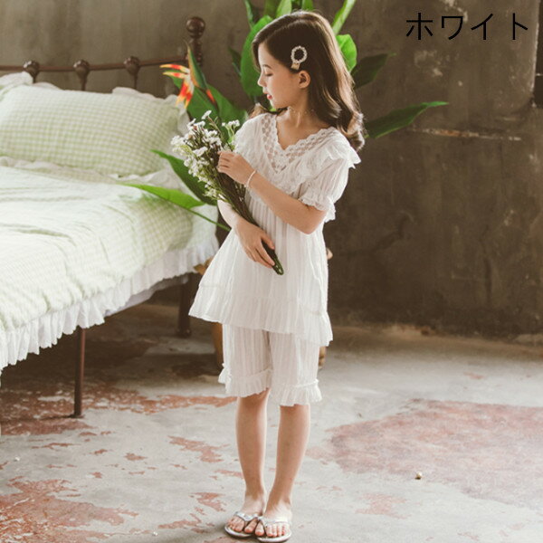 韓国子供服 女の子 パジャマ ルームウェア トップス + パンツ 2点セット 半袖 Vネック 夏 薄手 寝巻き キッズ おしゃれ 姫系 可愛い 部屋着 ジュニア 寝間着 ホワイト ライトブルー 110cm 120cm 130cm 140cm 150cm 160cm