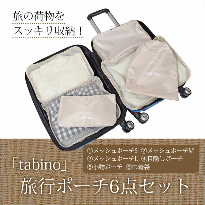 商品名:「tabino」旅行ポーチ6点セット グレージュ 旬なキーワード:バッグ ポーチ 巾着袋 メッシュ 収納 整理 旅行 便利グッズ セット